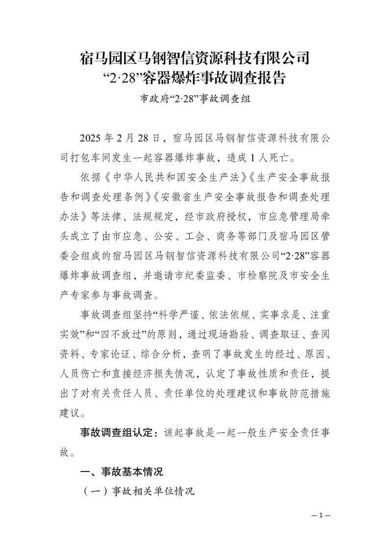 【事故调查报告】宿马园区马钢智信资源科技有限公司“2·28”容器爆炸事故调查报告 |