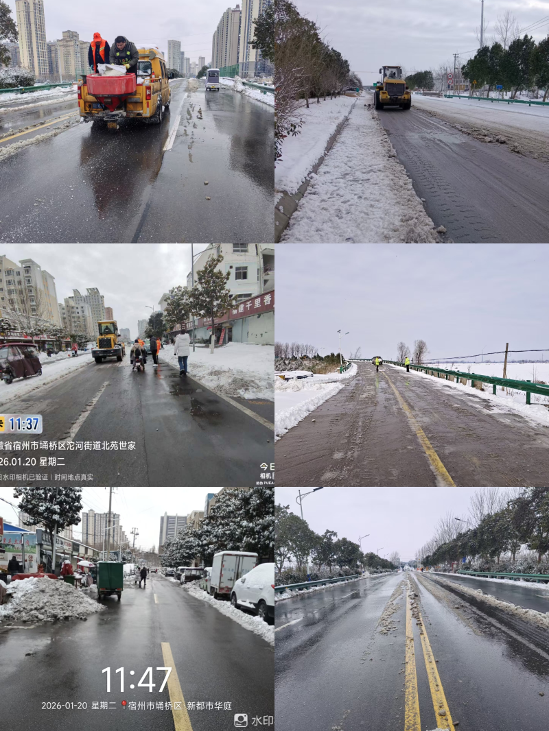 区委区政府高度重视,立即安排部署扫雪除冰工作。据不完全统计,区交通局、区公路分中心、区城管服务中心、区住建局及各镇街、园区共出动人员8392人次,铲雪除冰设备479台(辆),累计布撒融雪剂(盐)312.1吨,铺设防滑垫280处,已清理国省干线71公里、县乡道路120公里、乡镇路面172公里、背街小巷50公里,30条街道实现畅通,240个小区完成内部积雪清扫。辖区城乡客运班线和渡口全部停运。巡查供水管网400公里,供水范围内整体正常。埇桥供电供水、城郊供电公司共计出动抢修运维人员492人,辖区内38座变电站、75条输电线路、294条配电线路运行正常。超市、农贸市场等正常供应生活物资,价格平稳,其他重点区域管控正常。