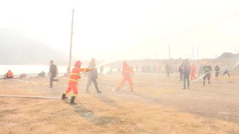 比武现场,各参赛队伍精神抖擞、斗志昂扬,展现出过硬的专业素养和顽强的战斗作风。油锯切割环节,操作队员精准检查装备、规范启动机器,平稳高效完成目标切割,尽显专业功底;风力灭火机协作扑打项目中,两名队员默契配合,从上风向同步推进,运用 “先弱后强、左右夹击” 战术快速扑灭模拟火堆;水泵射水与消防车水炮射水项目里,队员们分工明确、动作娴熟,迅速完成装备架设、水路连接、加压供水等操作,水柱精准直击打8 米线,充分展现了协同作战能力和以水灭火战术的实战应用水平。