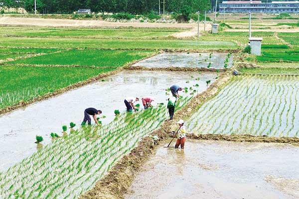 六月初夏,记者漫步在埇桥区夹沟镇镇头村镇头水库的堤岸上,放眼望去,连绵起伏的山丘、碧波荡漾的水库、郁郁葱葱的稻田……仿佛置身江南水乡。村民们挽起裤脚踏入齐膝的泥浆,弯腰插秧的身影连成墨色波浪,鲜嫩的秧苗随着灵巧的指尖,在水面迅速铺展出整齐的翠色方阵。